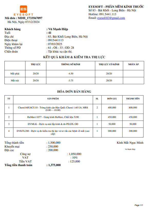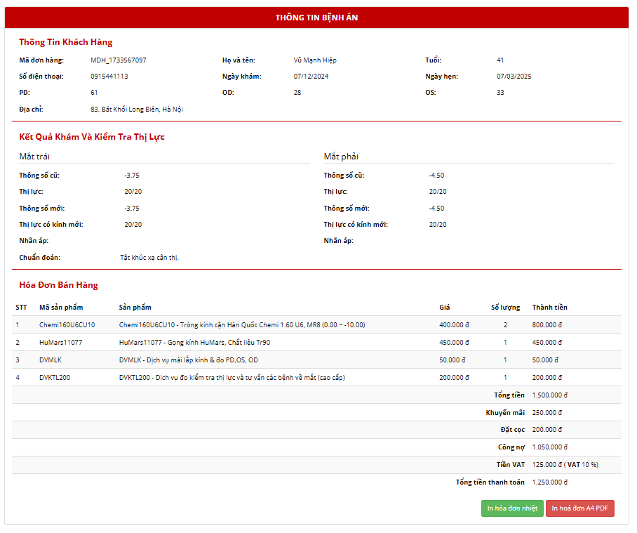 - File PDF trả kết quả đo, kiểm tra thị lực và hóa đơn mua hàng của Quý khách.